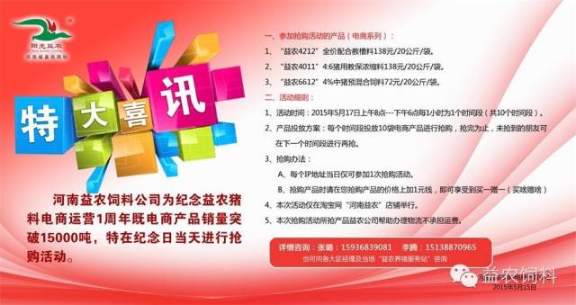 ?特大喜訊:河南益農(nóng)飼料公司為紀念益農(nóng)豬料電商運營1周年既電商產(chǎn)品銷量突破15000噸,特在紀念日當天進行***活動,具體方案如下: