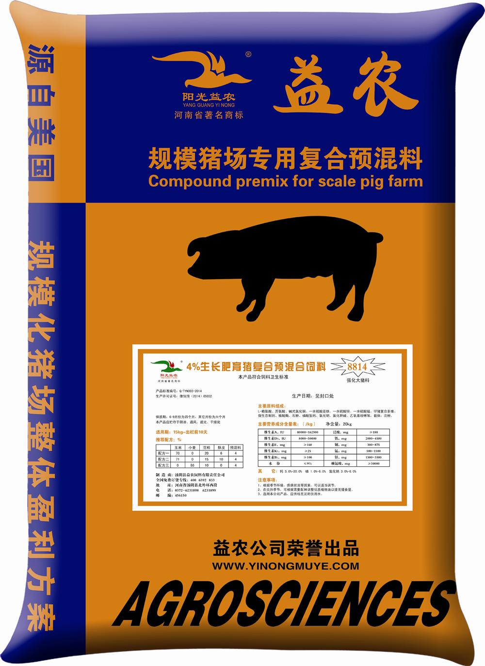 一、產(chǎn)品名稱:4%強(qiáng)化育肥豬預(yù)混合飼料“益農(nóng)8814”.